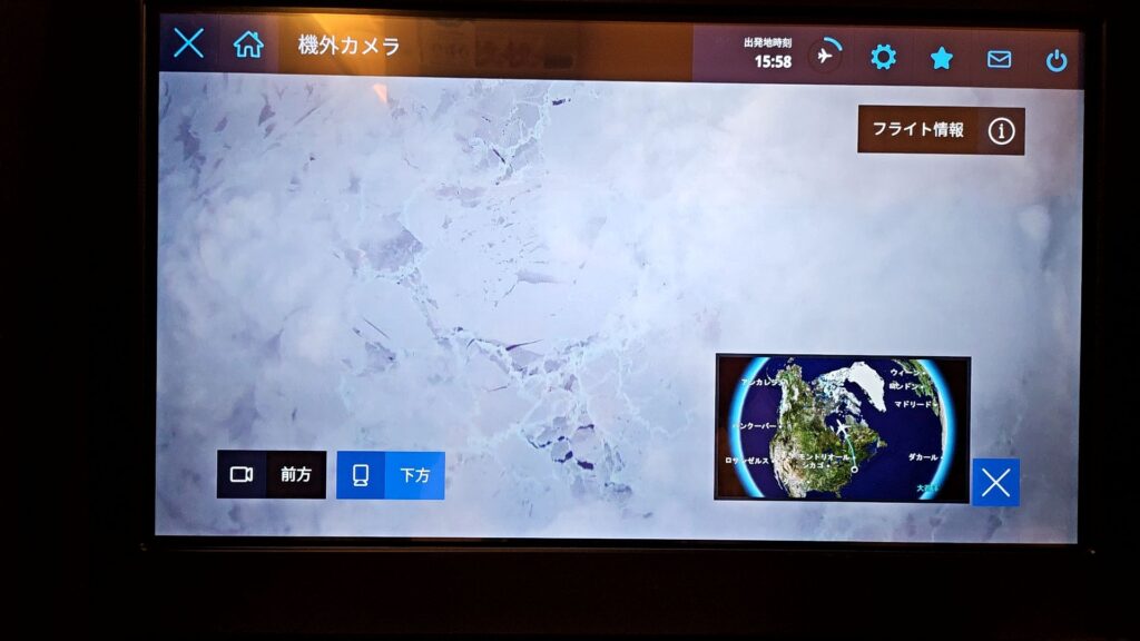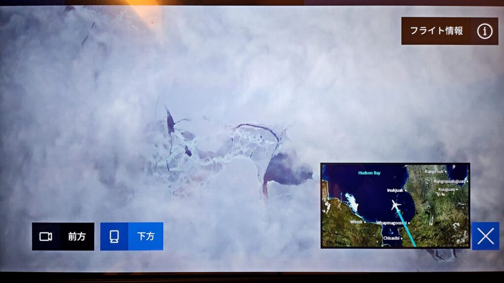 モニターの下方カメラを見るとカナダのハドソン湾です。凍っているのが見えました。ホッキョクグマがいるそうですがさすがに見えませんでした(笑)