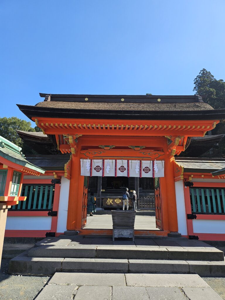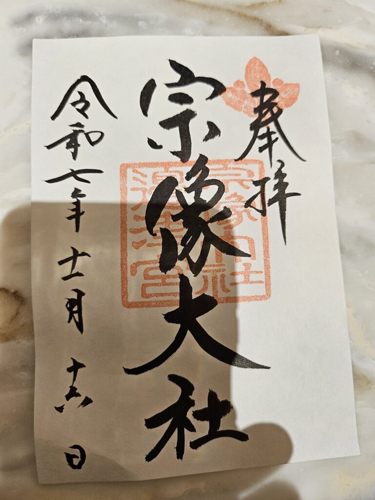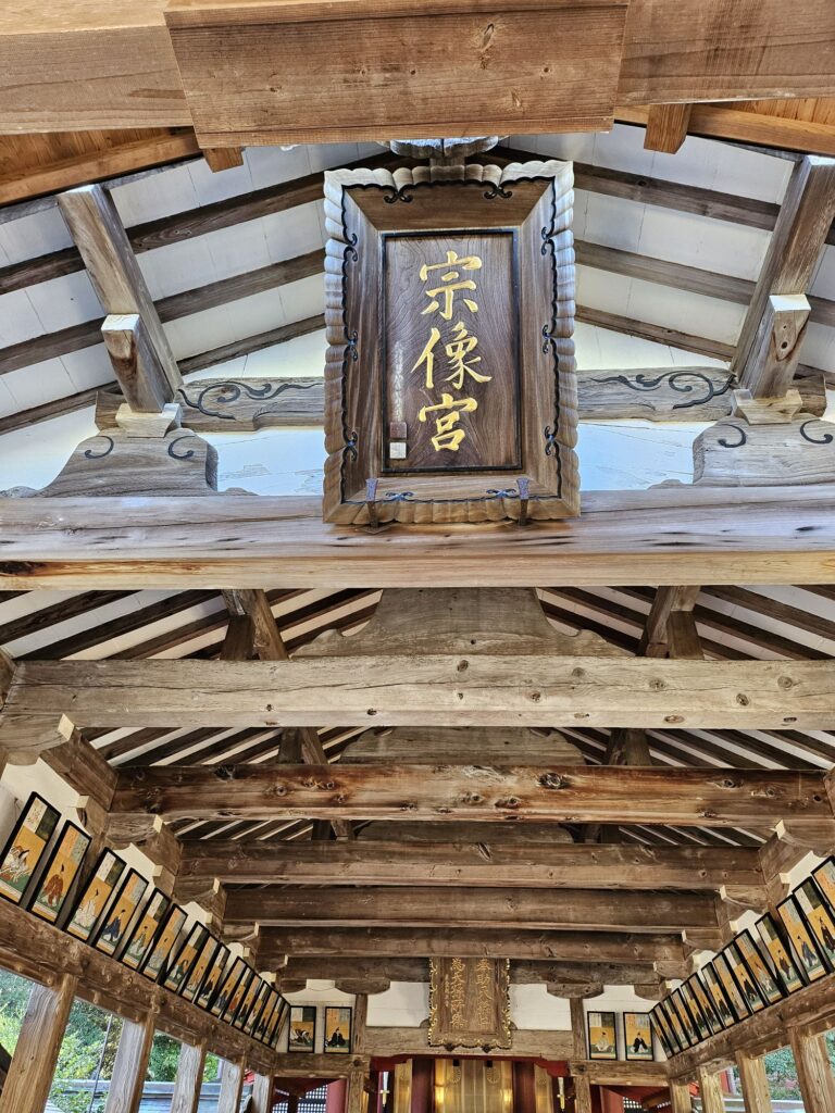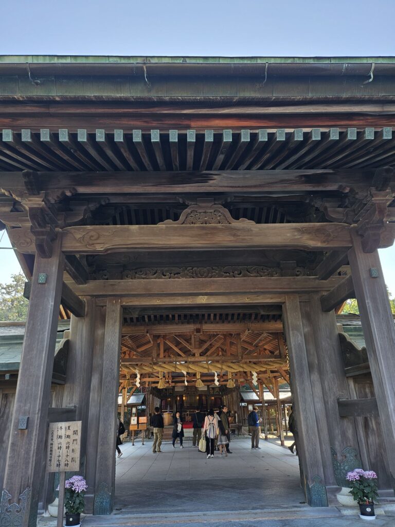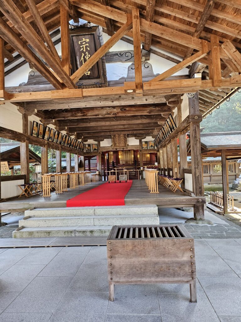 まずは世界遺産の『宗像大社』です。とても素敵な神社で多くの参拝客が訪れていました。宗像大社は、日本神話に登場する日本最古の神社の一つで御祭神は天照大神の三女神で、沖津宮、中津宮、辺津宮にそれぞれ祀られ、これらを合わせて宗像大社といいます。今回は辺津宮へ行きます。他は船で行く必要がありこの中でもいちばん遠い沖津宮は一般人では入れないはず…