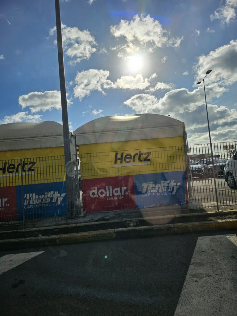 バーリ空港に着きました。ハーツレンタカーはゴールドメンバーなので車の鍵は用意されていて駐車場に直接行けばよいとのことでレンタカーを借りるところまで200メートルです。奥に黄色い看板のハーツがあります。