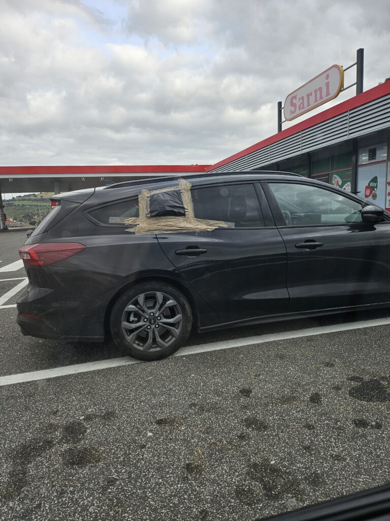 これから三時間以上かけてフィレンツェに向かいます。途中昨日外れたタイヤ回りにテープを貼るためにパーキングで買いに寄ると窓を破損してテープを貼っている人が偶然いてテープで私の車を修理してくれました。