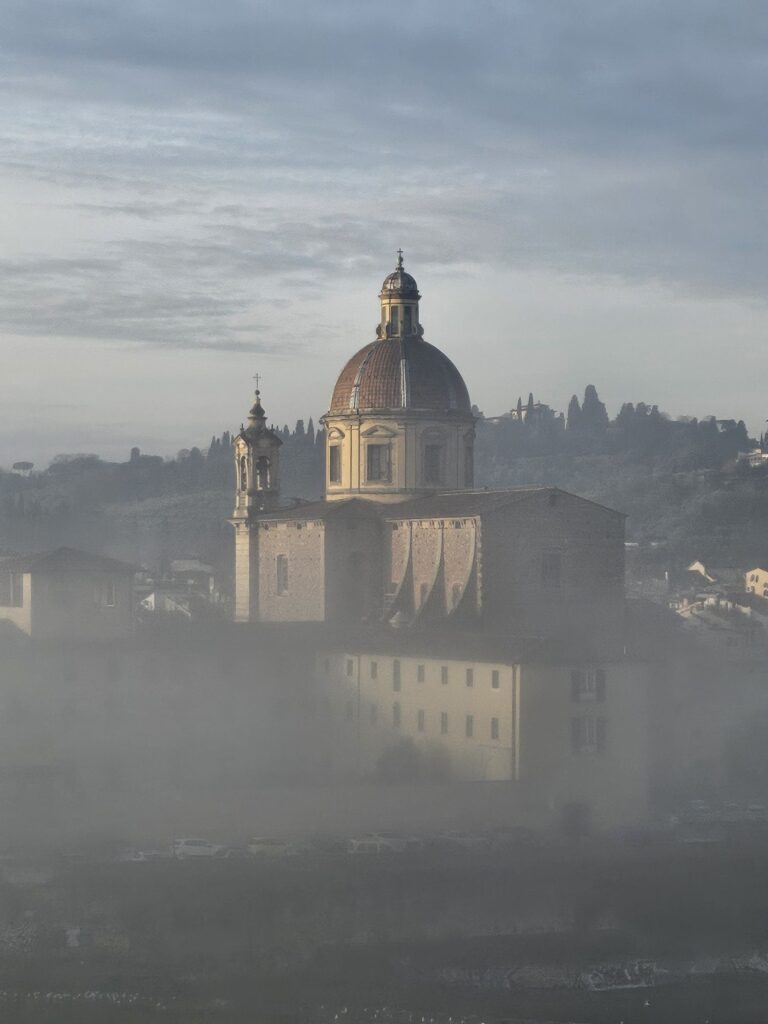 食事を終えて部屋から外を見ると霧が出て真っ白でしたが徐々に晴れてきて幻想的な写真が撮れました。Chiesa di San Frediano in Cestelloです。