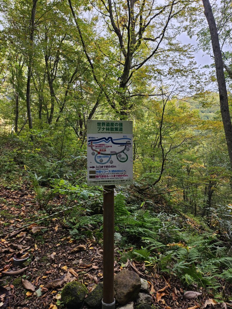 下の地図の世界遺産の径ブナ林散策道を歩きます。実は今回二回目で前回は径の右側の小回り(下の地図、緑線の右側周回路)を歩いたのですが家でユネスコの世界遺産サイトの地図を見ると小回りは世界遺産範囲外のようなのでリベンジなのです。