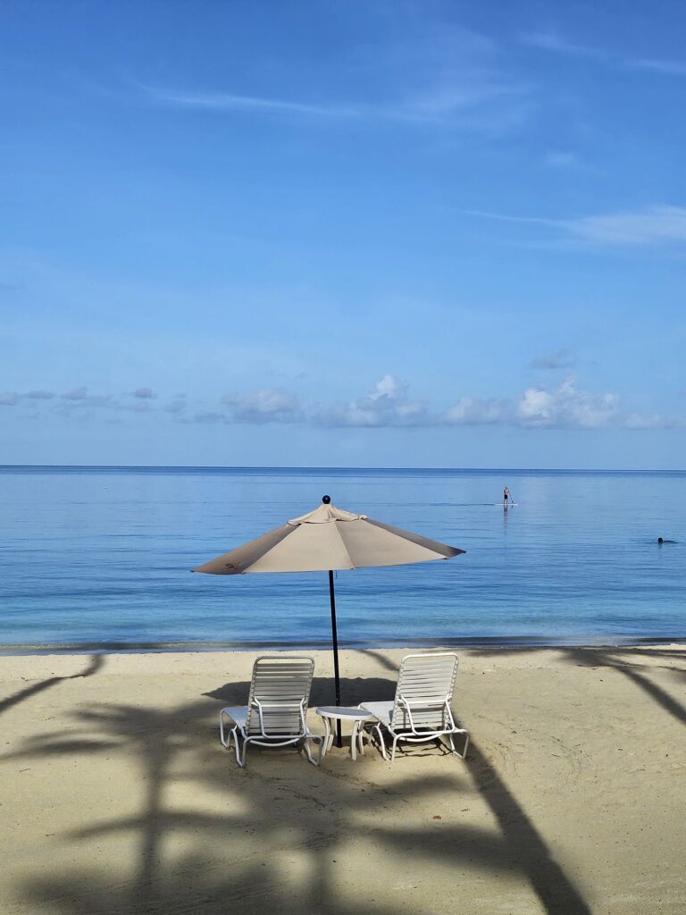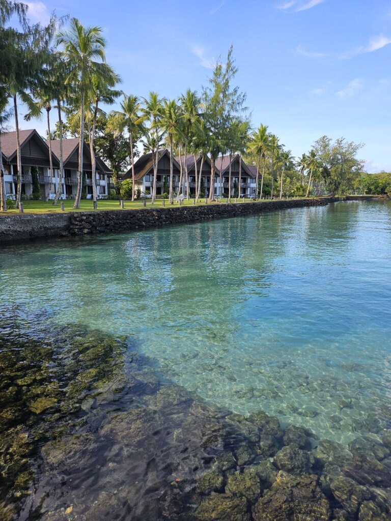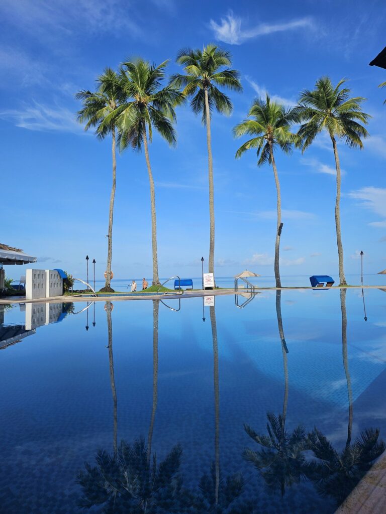 ホテルの朝です。とても綺麗!白い砂浜、青い海がつづいて海をのぞき込むと魚がおよいでいて海底まで見えるほど透き通っています。本当に美しい!!