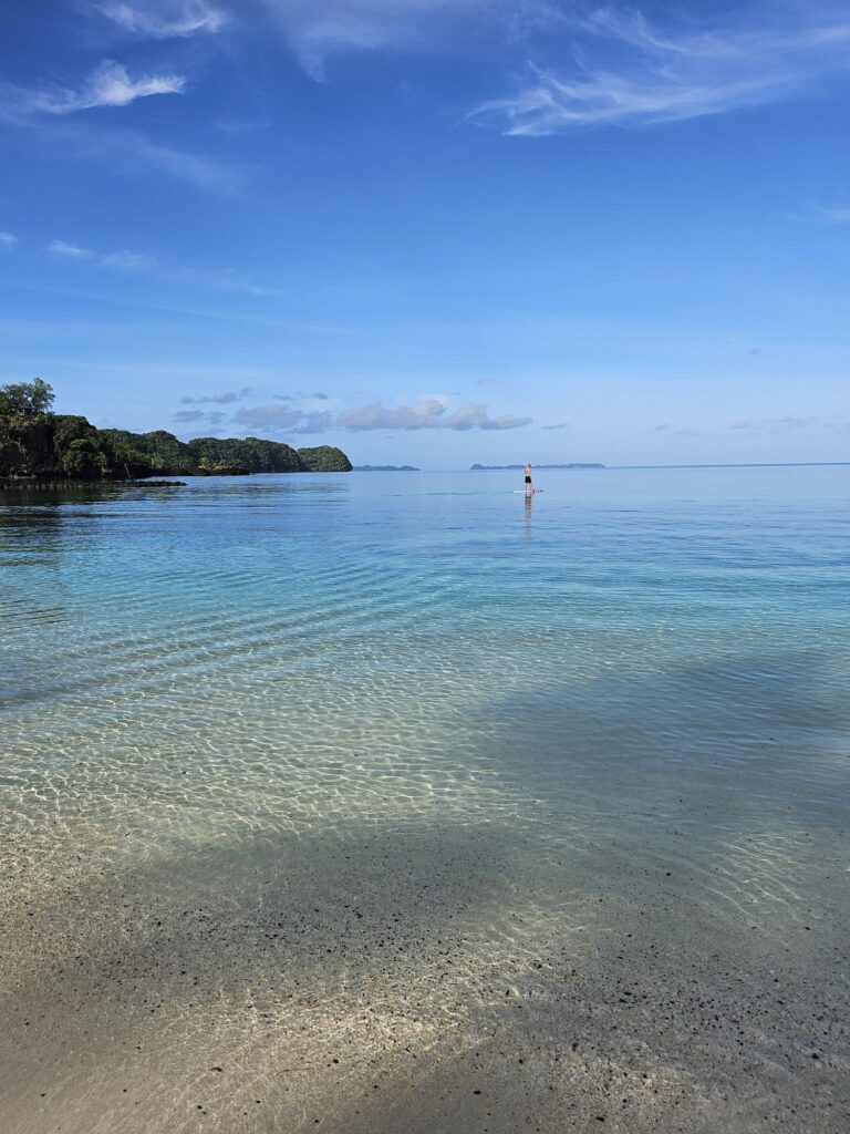 波もなく小さな子でも遊べる砂浜です。紫外線は強く日本の8倍くらい。日焼け止め必須ですがパラオはサンゴ等の自然保護のために日焼け止めでも使用禁止の成分があるので要確認です。