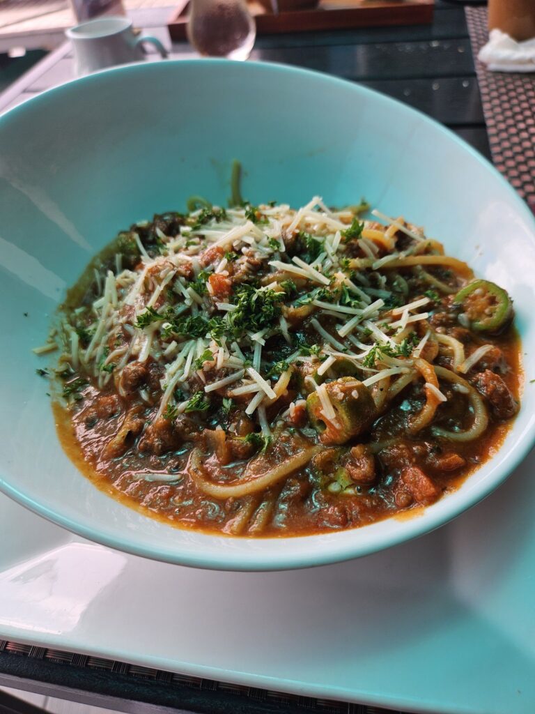 スパゲッティー・ボロネーゼにしました。アイスコーヒーはおかわり無料でした。