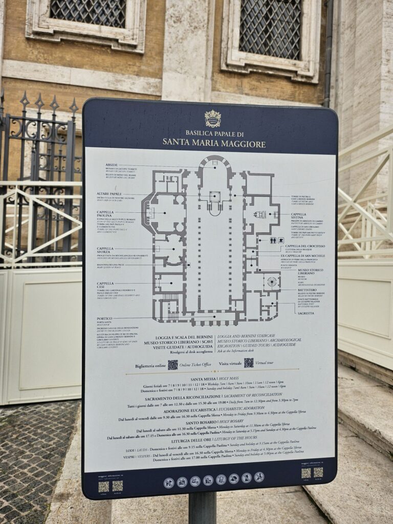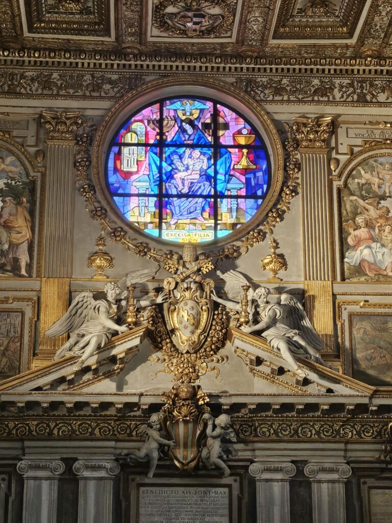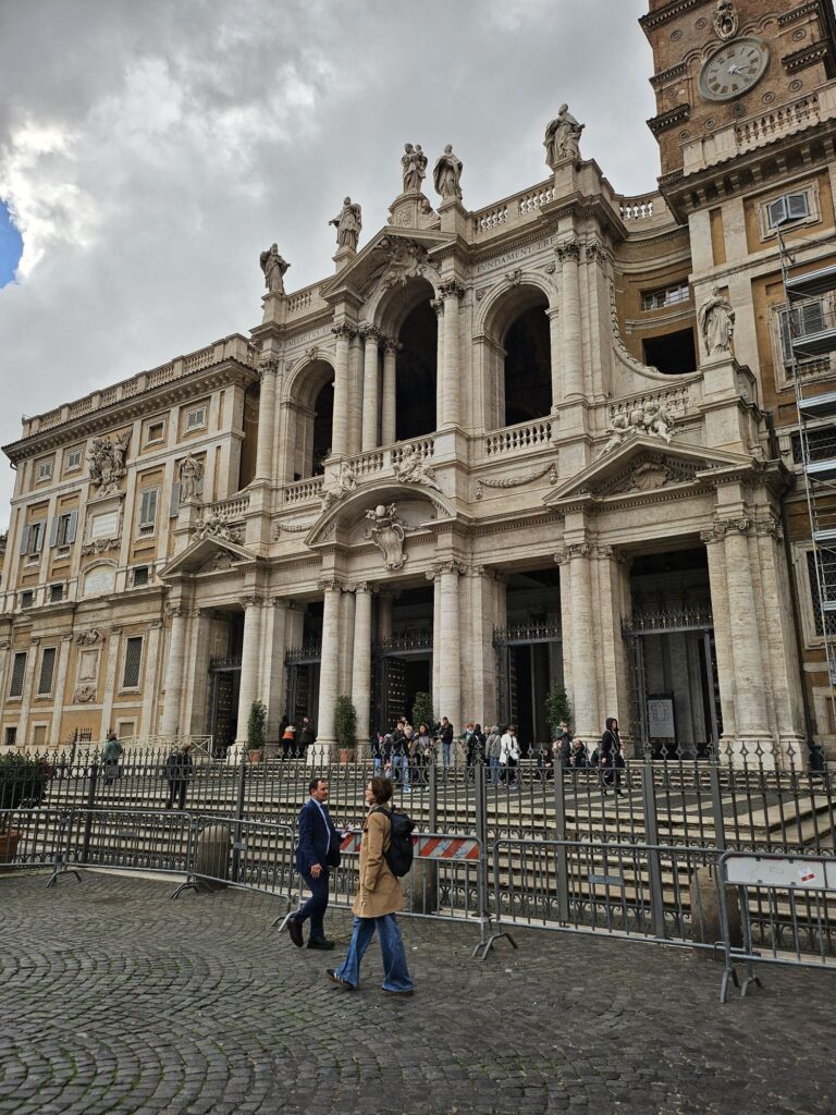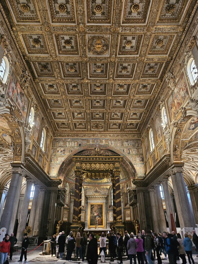 次にサンタ・マリア・マッジヨーレ教会(聖母マリアの聖堂)に行きました。4世紀に教皇リベリウスの夢に聖母マリアがあらわれて「今晩雪の降ったところに教会を建てなさい」と命じられ8月にもかかわらず雪がこの場所に降ったそうです。世界聖堂のなかでも特に重要な教会で母なる教会。ローマ4大聖堂の1つでバチカン管理の教会です。教皇フラシスコのお墓があります。
